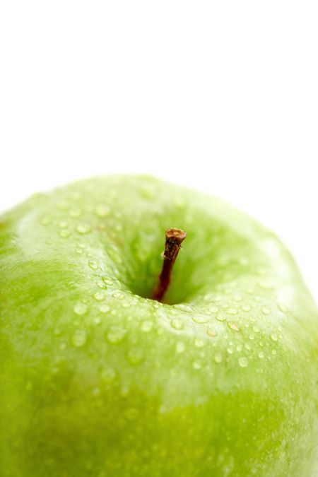 green apple close up with water drops isolated over a white background