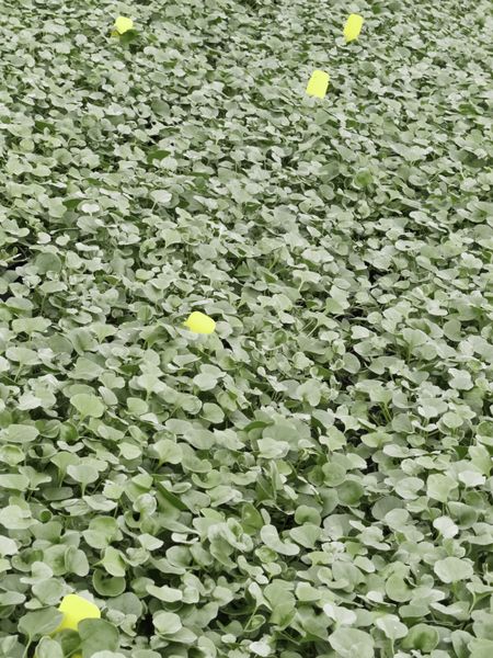 Green creeper (Genus: Dichondra; species: unidentified; cultivar: Silver Falls), often considered a lawn weed, with yellow plastic markers, growing in greenhouse for transplantation on golf course