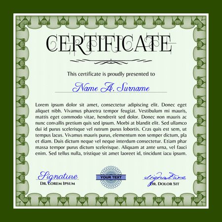 Green horizontal certificate, diploma or coupon template with very complex border design and sample text.