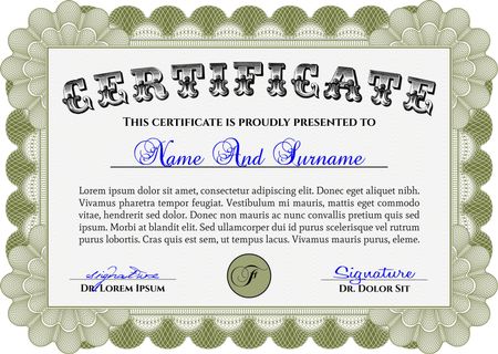 Green horizontal diploma or certificate template. Complex design. With sample text and background