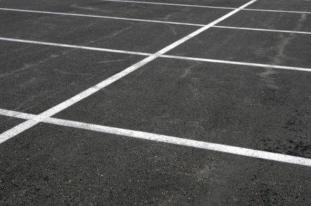 Grid of white lines on weathered asphalt parking lot