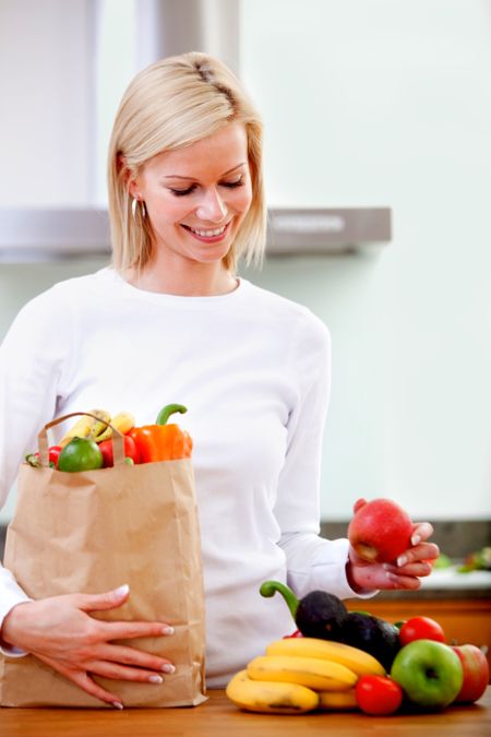 Grocery shopping woman taking out her purchases from a paper bag