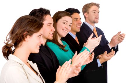 group of business people in an office applauding and smiling at success - focus is on the girl looking at the camera - isolated over white