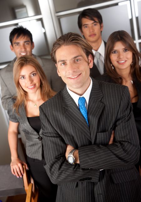 group of business people standing in an office smiling