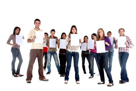 Group of casual people isolated holding white cardboards to fill in