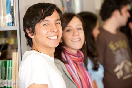 group of college or university students in a library smiling