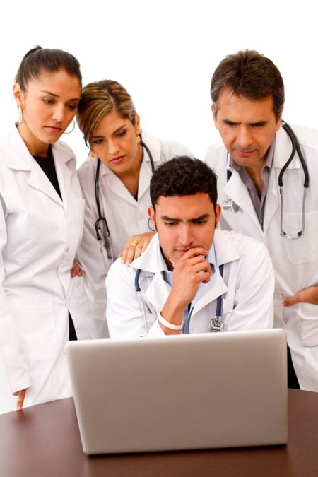 Group of doctors with a computer - isolated over white