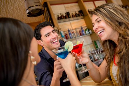 Group of friends at the bar having drinks and smiling