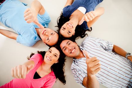 Group of friends with their heads together on the floor and thumbs up - isolated