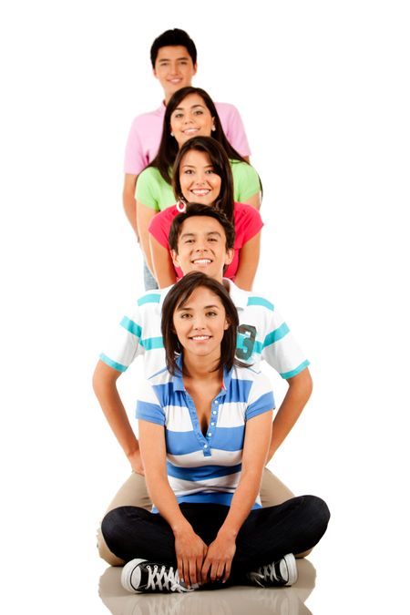 Group of happy friends sitting on the floor making a pyramid ? isolated