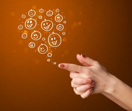 Group of happy hand drawed smiley faces coming out of gun shaped hands