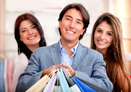 Group of happy shopping people and a man holding bags