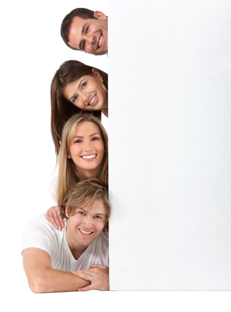 Group of people with a banner isolated over a white background