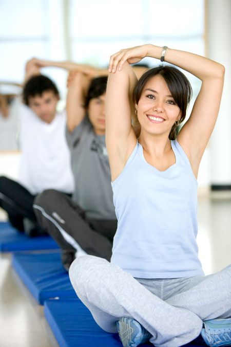group of people at the gym smiling an doing stretching exercises