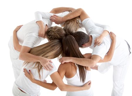 Group of people hugging isolated over a white background