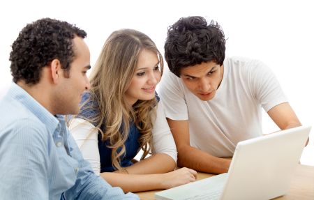 Group of people with a laptop isolated over a white background