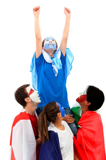 Group of people lifting a victorious Argentinean woman - isolated over white
