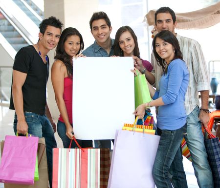 Group of shoppers holding a banner ad and some bags in a shopping mall
