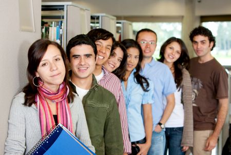Group of students at a library smiling