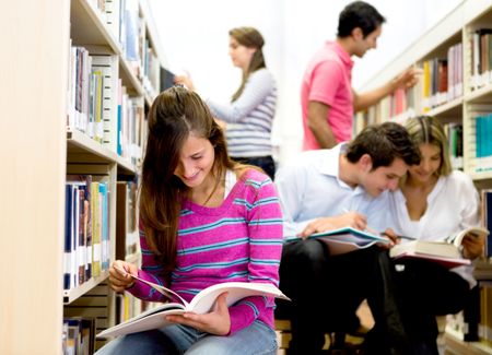 Group of students researching at the library and reading books