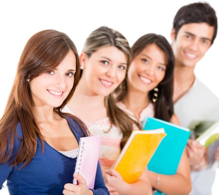 Group of students in a row - isolated over a white background