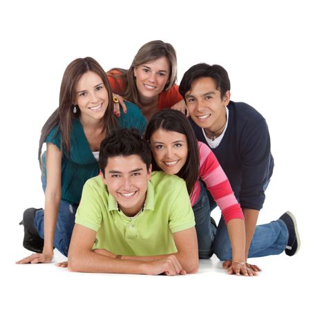 Group of young people lying on the floor - isolated over a white background