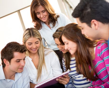 Group of young people studying and looking at notes
