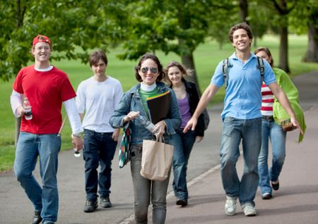 Group of young people walking outdoors and smiling