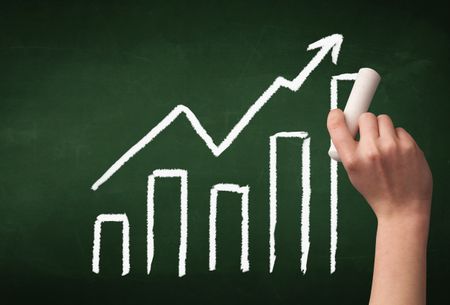 A grown up's hand drawing chart with exponentially growing arrow on green chalkboard