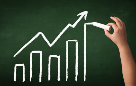A grown up's hand drawing chart with exponentially growing arrow on green chalkboard