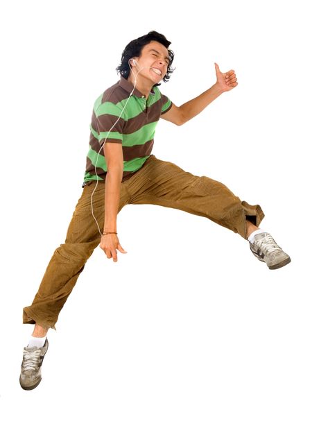 guy enjoying his music jumping in the air isolated over a white background