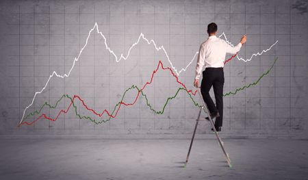 A guy in modern suit standing on a small ladder and drawing a chart on grey wall background with exponential progressing curves, lines