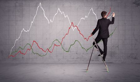 A guy in modern suit standing on a small ladder and drawing a chart on grey wall background with exponential progressing curves, lines