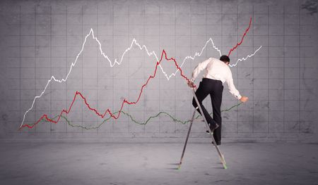A guy in modern suit standing on a small ladder and drawing a chart on grey wall background with exponential progressing curves, lines