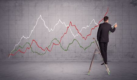 A guy in modern suit standing on a small ladder and drawing a chart on grey wall background with exponential progressing curves, lines