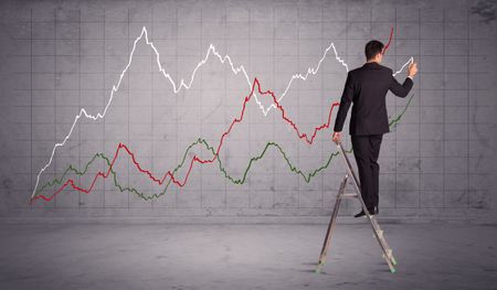 A guy in modern suit standing on a small ladder and drawing a chart on grey wall background with exponential progressing curves, lines