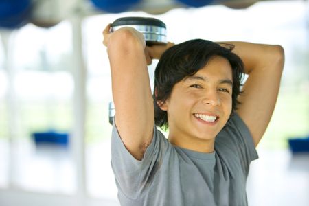 Gym man holding free weights behind his head
