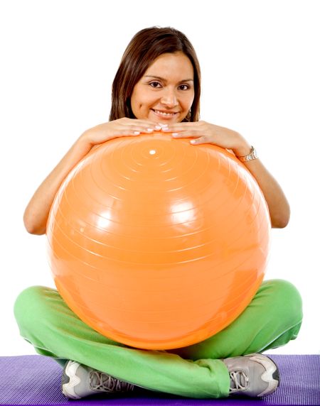 Gym woman with a pilates ball sitting on the floor isolated on white