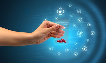Hand delivers colorful pills in small plastic bag with medicine concept