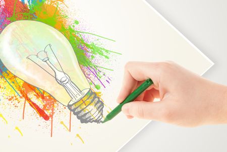 Hand drawing on a plain paper a colorful splatter lightbulb