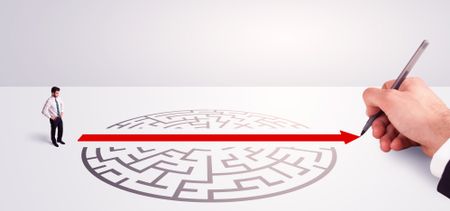 Hand drawing solution for successful businessman standing near the entrance of labyrinth