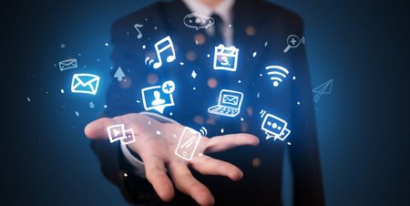Hand holding application icons and symbols in her hand