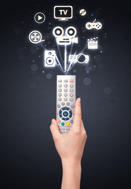 Hand holding a remote control, media icons coming out of it