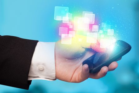 Hand holding smart phone with abstract glowing squares concept