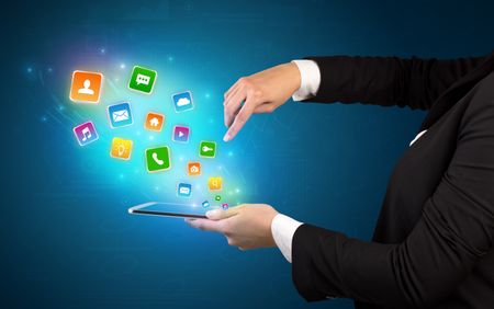 Hand holding tablet and application icons falling inwards