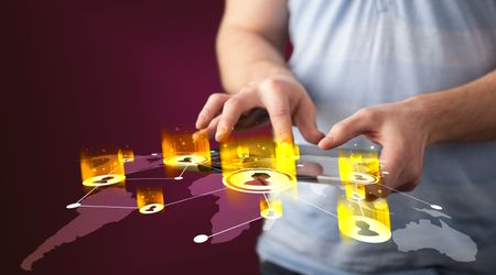 Hand holding tablet device with social network map concept on background