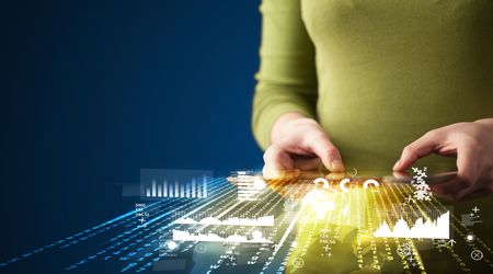 Hand holding touchpad tablet with business market graphs and icons concept on background