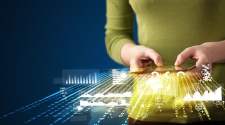 Hand holding touchpad tablet with business market graphs and icons concept on background