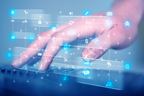 Hand pressing keyboard with high tech media icons and symbols