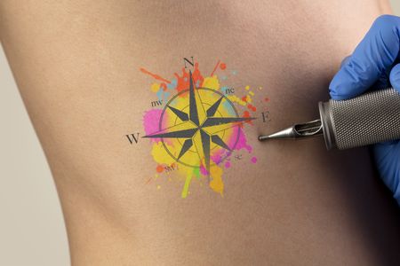 Hand tattooing colourful traveling concept on naked clear skin